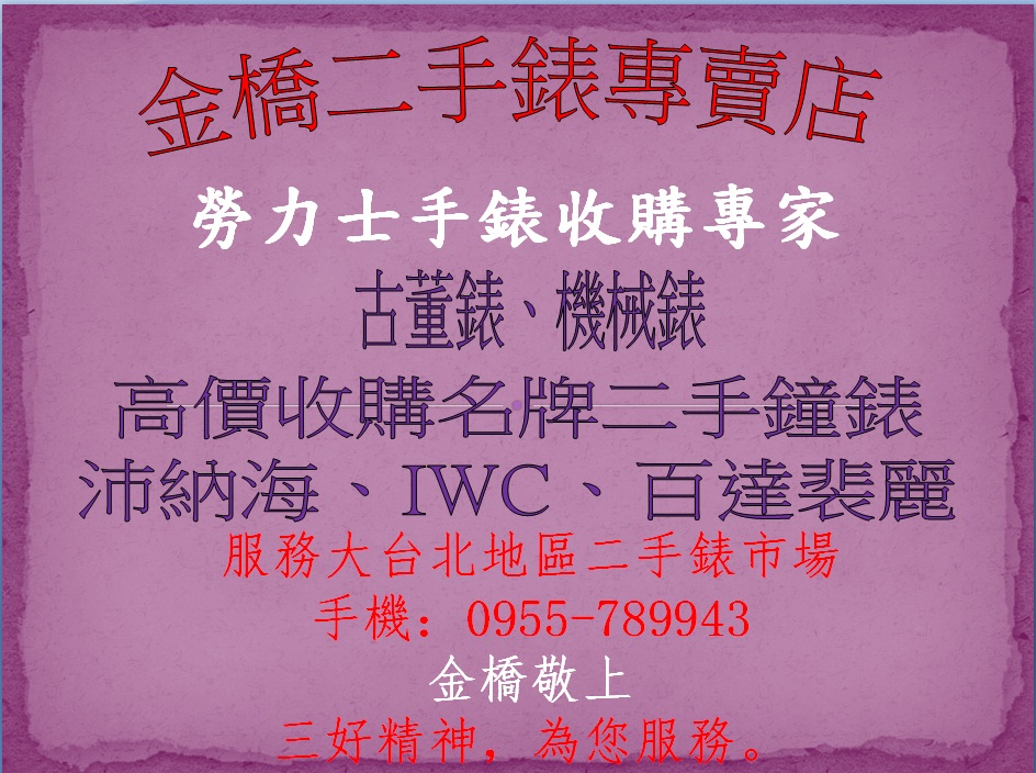 高價收購勞力士手錶及各大品牌機械錶且代客贖回當鋪之手錶,買賣收購名牌手錶、二手手錶、勞力士手錶、機械手錶、k金手錶、鑲鑽手錶、純金手錶、金飾、金鍊任何錶均有意願。